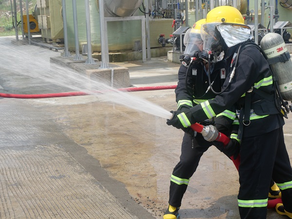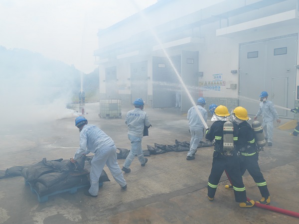 本次应急演练模拟的场景是一名员工在操作叉车转移废有机溶剂时,因操作失误,前叉猛烈撞击3#暂存仓库大门,导致废有机溶剂泄漏并引发火灾,造成安全事故。演习中,在模拟事故发生后,中机茂名立刻启动车间级响应,经过车间组织紧急灭火救援后,火势仍无法得到控制,且一名灭火员工因吸入有害气体而出现头晕、恶心等症状,随即启动公司级响应,各应急救援小组紧急集合并配合抢险救援,最终顺利完成灭火和救援任务。